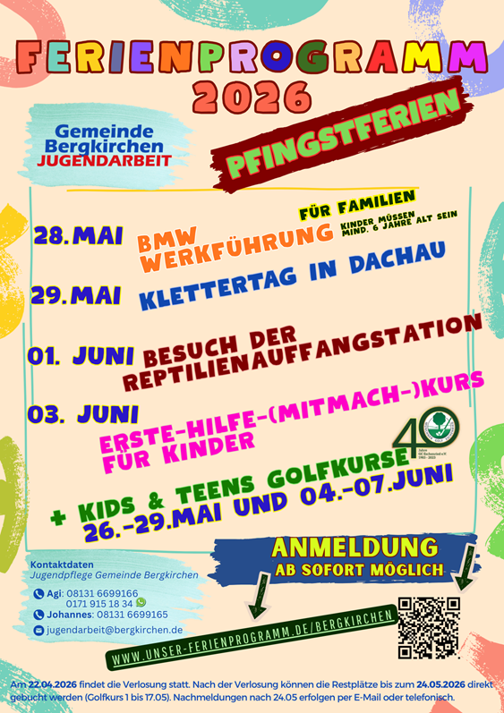 Die Anmeldung ist ab sofort unter www.unser-ferienprogramm.de/bergkirchen möglich. Die Verlosung findet am 22.04.2026 statt. Nach der Verlosung können Restplätze bis zum 24.05.2026 direkt gebucht werden (für den Golfkurs 1 gilt die Frist bis zum 17.05.2026). Nachmeldungen sind ab dem 25.05.2026 per E‑Mail oder telefonisch möglich.